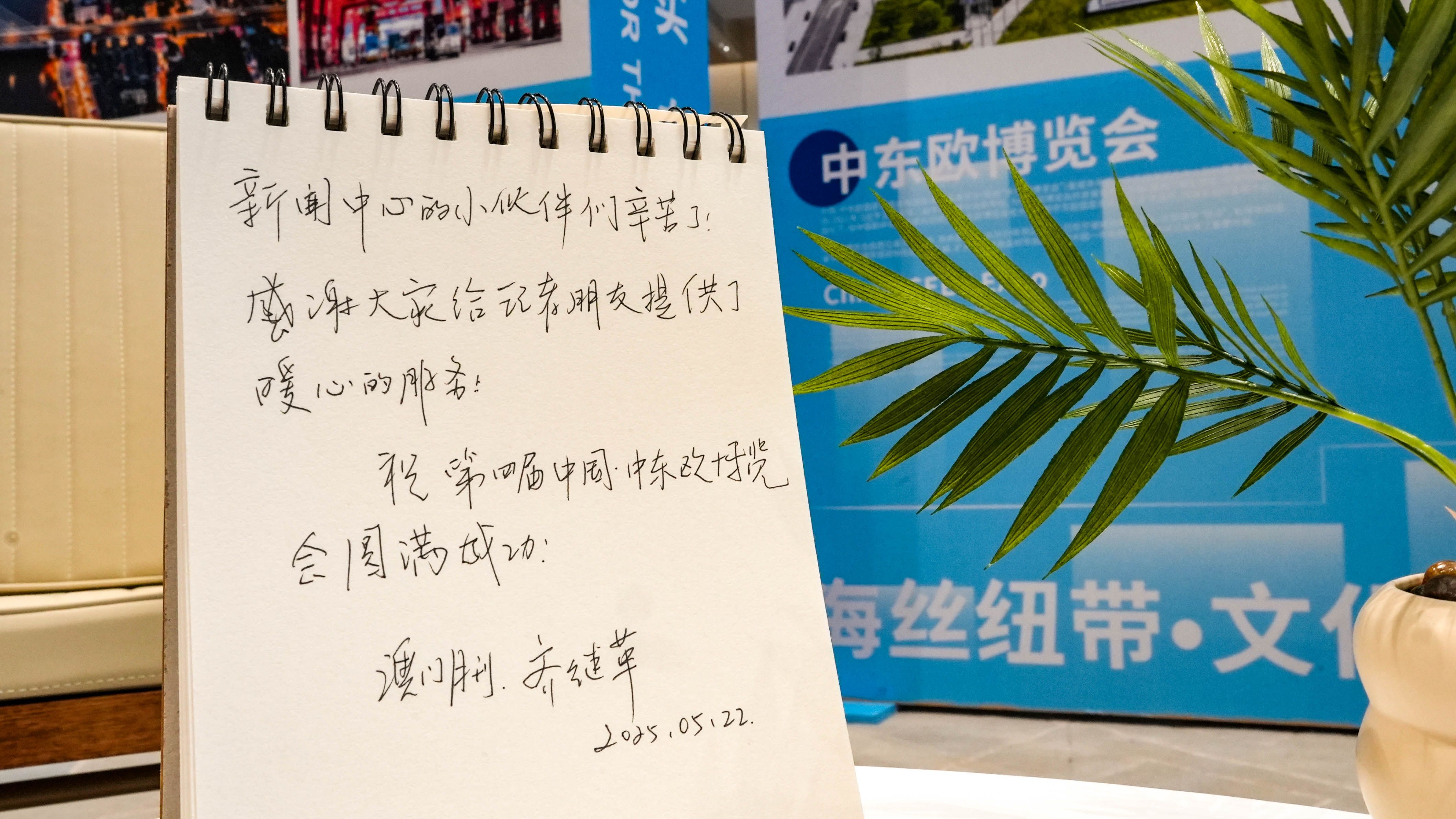 新華社記者留言稱贊:“記者溫暖的家,謝謝貼心服務(wù)”。波黑籍記者在留言本上寫下“這是我第二次來寧波,很喜歡回家的感覺!感謝款待!”;斯洛伐克記者留言“寧波是個(gè)很有活力的城市,我很高興斯洛伐克與中國合作,很榮幸能夠參與此次博覽會(huì)!”;塞爾維亞記者留言“向?qū)幉ǖ闹袊笥褌冎乱詯垡猓@里的一切讓我印象深刻,希望能不斷鞏固塞爾維亞和中國人民的友誼!”。
