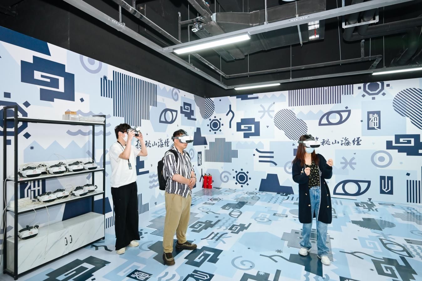 展館分為“靜態(tài)展陳”“光影互動(dòng)”“VR大空間”和“文創(chuàng)體驗(yàn)”四大主題展區(qū),面積近1000平方米,通過(guò)故事繪畫(huà)、創(chuàng)意雕塑、裝置藝術(shù)、多媒體光影等多種藝術(shù)表達(dá)方式,將《山海經(jīng)》中的神獸怪物、神話人物、奇異國(guó)家、山川地貌等內(nèi)容形象直觀地呈現(xiàn)在游客面前,讓平面的文字變得立體和豐富。游客還能戴上VR設(shè)備,身臨其境般地感受《后羿射日》《女?huà)z補(bǔ)天》的神話故事,沉浸式感受山海奇幻元宇宙,在寓教于樂(lè)中體會(huì)中國(guó)上古神話的浪漫之美。文創(chuàng)區(qū)特別設(shè)置集章打卡活動(dòng),提供100枚主題印章,可免費(fèi)收集并定制專屬“山海神獸冊(cè)頁(yè)”。