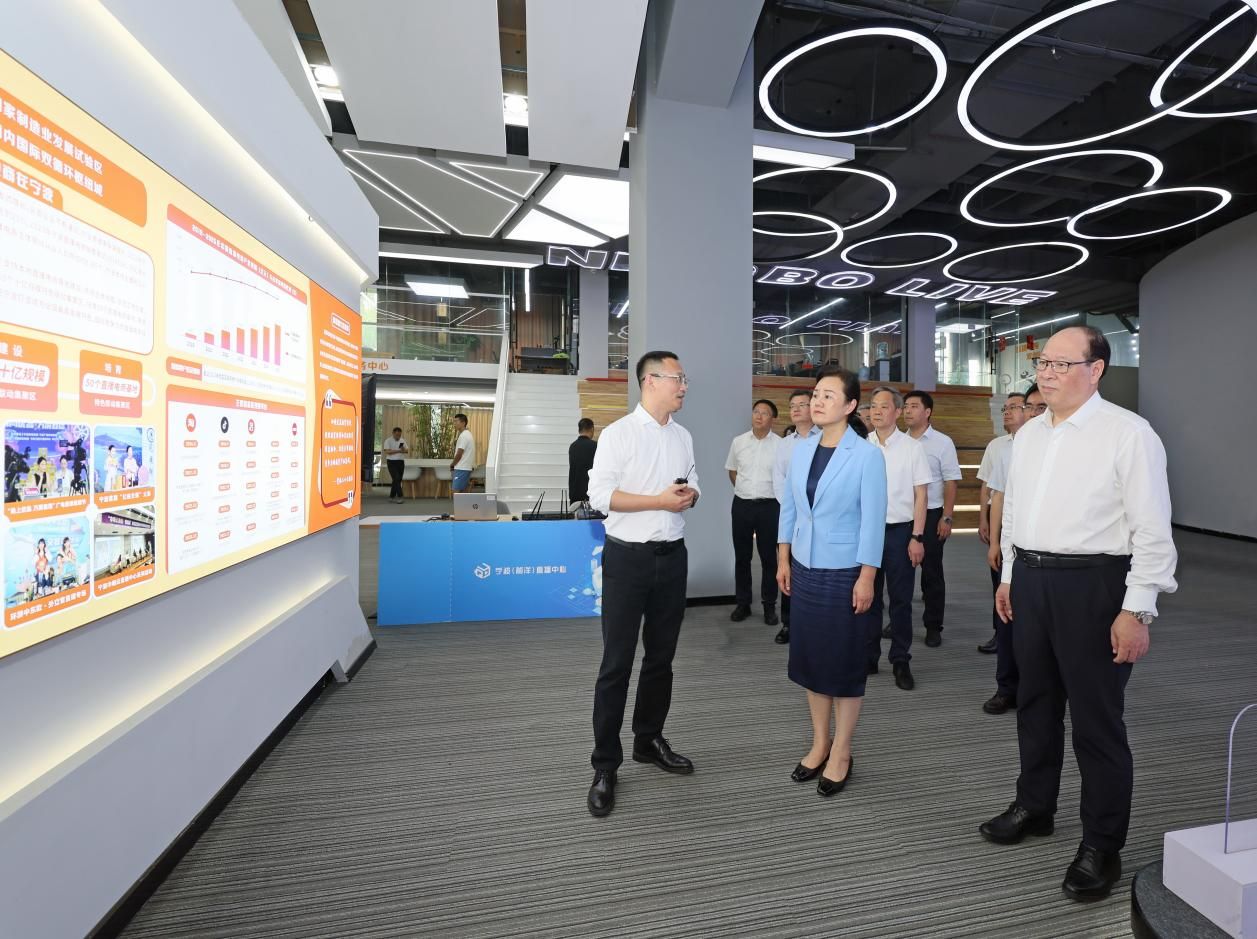 6月19日下午,重慶市委常委、萬(wàn)州區(qū)委書(shū)記盧紅率考察團(tuán)到寧波廣電集團(tuán)旗下寧波(前洋)直播中心,調(diào)研直播產(chǎn)業(yè)服務(wù)平臺(tái)打造、直播行業(yè)及互聯(lián)網(wǎng)黨建、對(duì)口協(xié)作生態(tài)平臺(tái)構(gòu)建、跨境直播服務(wù)平臺(tái)等工作,考察交流以新業(yè)態(tài)新模式推動(dòng)產(chǎn)業(yè)高質(zhì)量發(fā)展的實(shí)踐做法。浙江省委常委、寧波市委書(shū)記彭佳學(xué),寧波市委常委、市委秘書(shū)長(zhǎng)奚明,市政府黨組成員、寧波經(jīng)濟(jì)技術(shù)開(kāi)發(fā)區(qū)黨委會(huì)主任葉苗及江北區(qū)委書(shū)記張國(guó)鋒,寧波廣電集團(tuán)黨委書(shū)記、總裁李可等陪同。