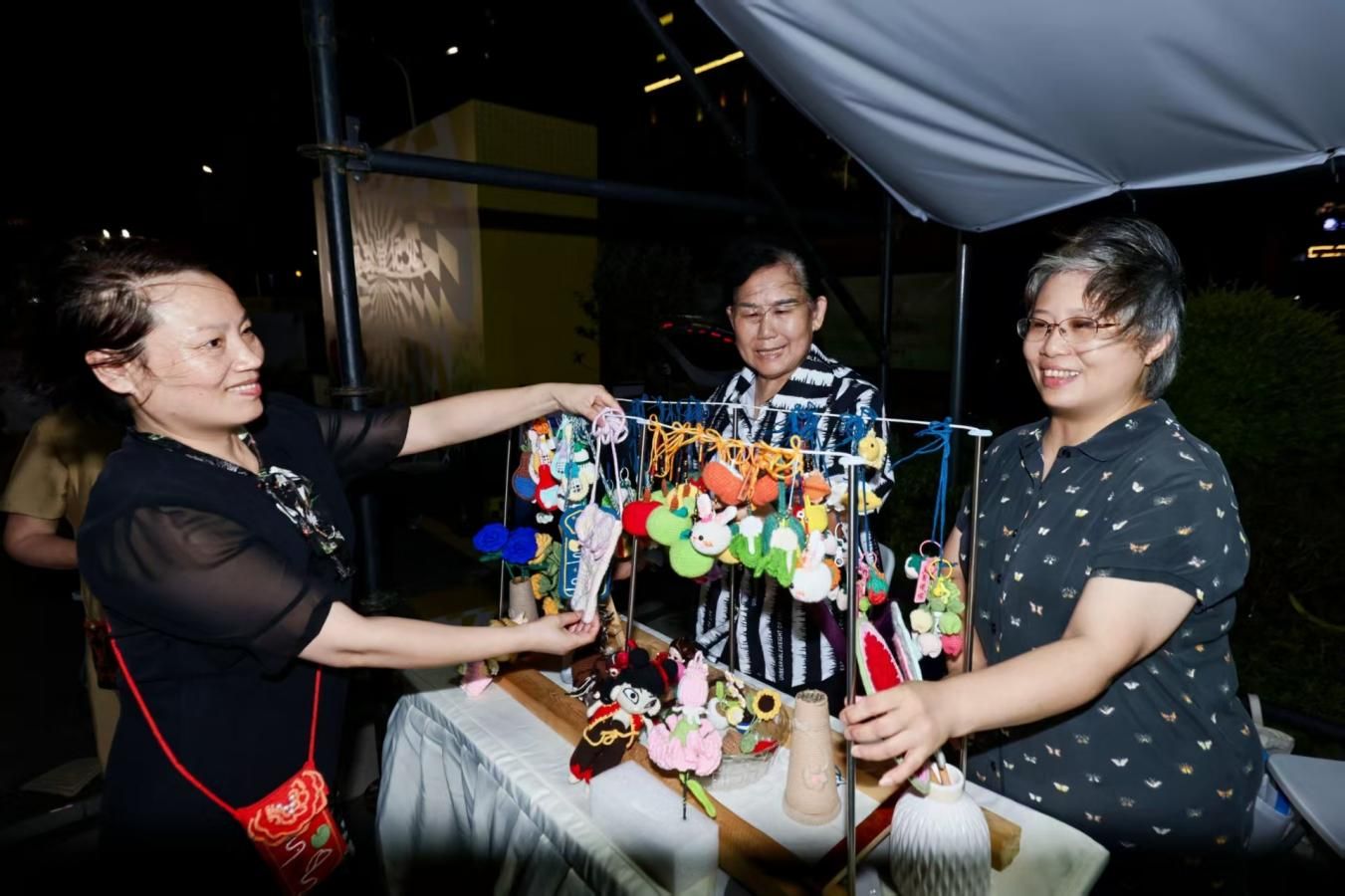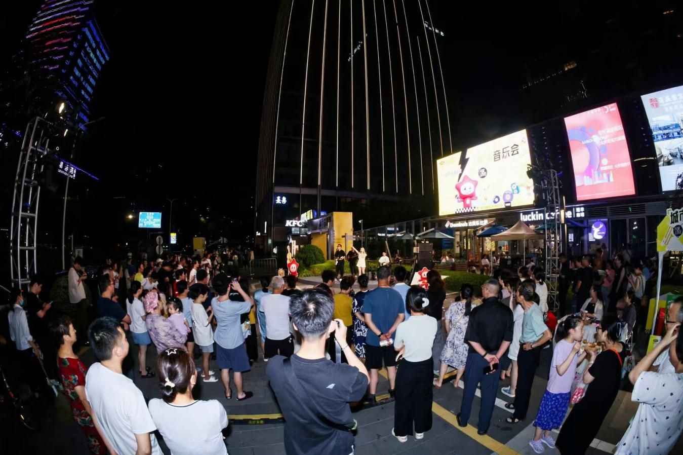 夜幕下的新明,東側(cè)廣場的主舞臺上,現(xiàn)場樂隊(duì)的音樂演出為夜晚增添了無限活力。現(xiàn)場還專門設(shè)置了美食攤位、文體集市以及特色展位,觀眾在享受音樂的同時(shí),還能品嘗到各式美味小吃,了解豐富的文體資訊,共享新明美好時(shí)刻。