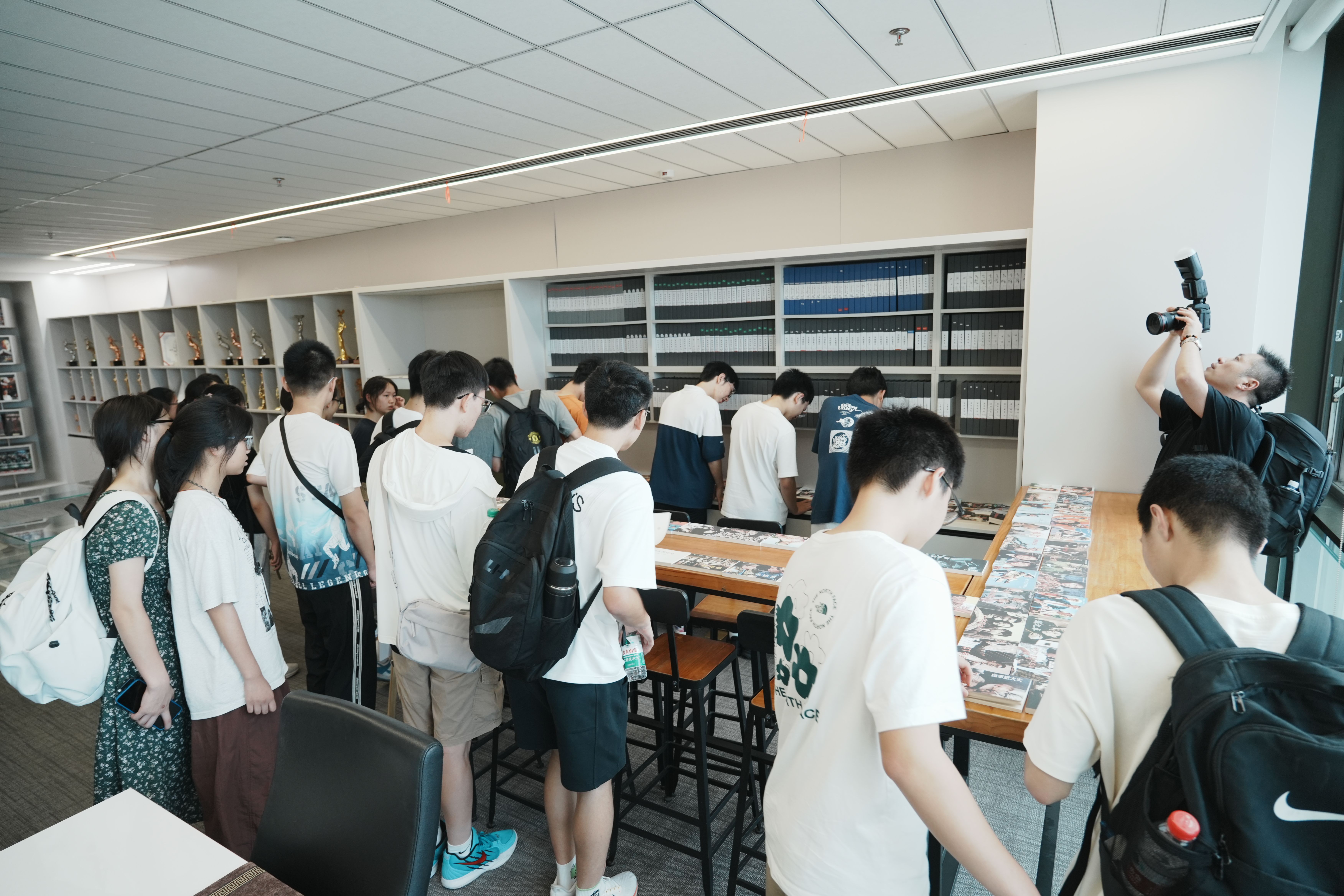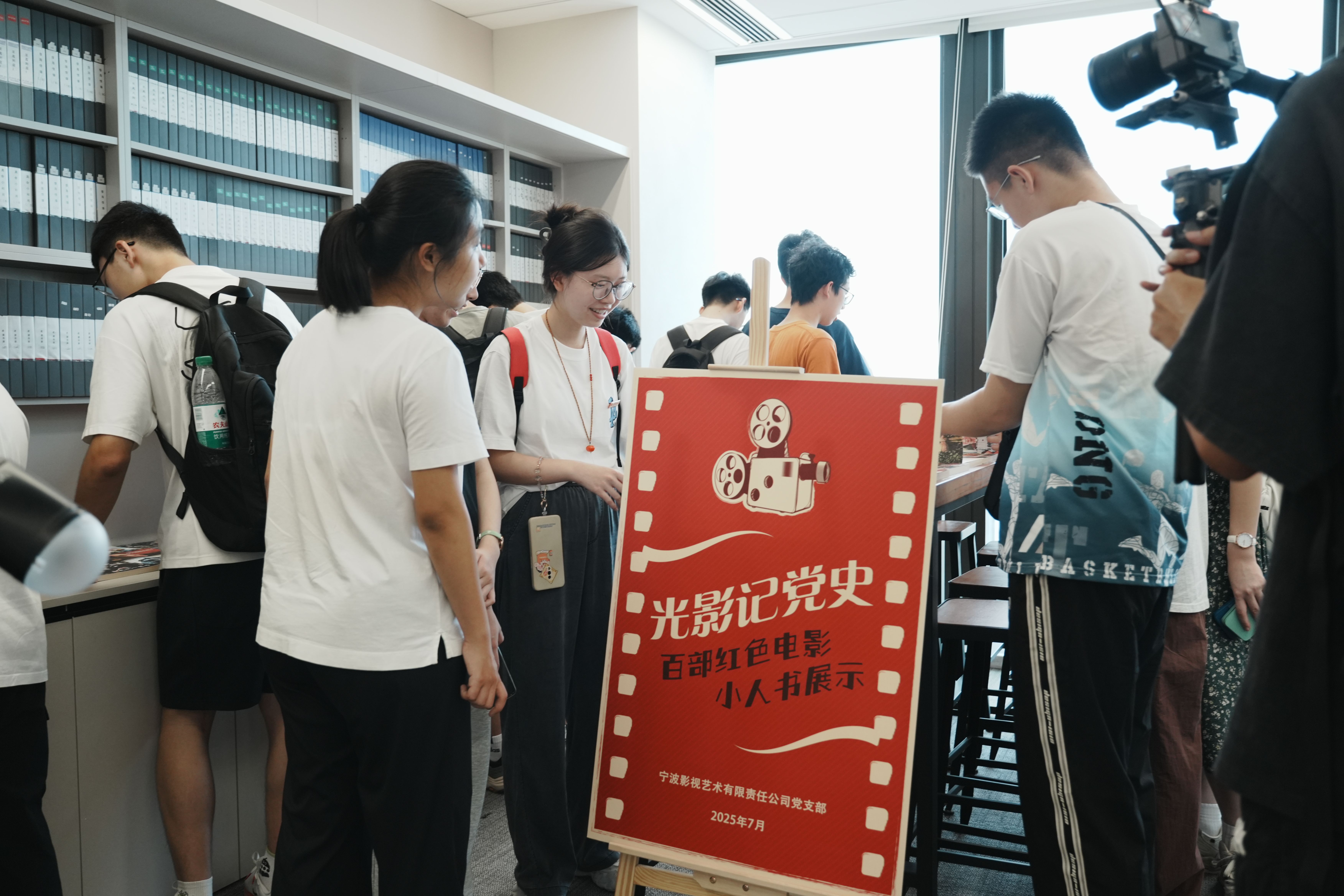 7月22日下午,鎮(zhèn)海中學高三(5)班的二十多位學生參觀了寧波廣電集團,最后一站來到了寧波影視藝術有限責任公司陳列室。在“光影記黨史”百部紅色電影小人書展示臺,每個學生拿起自己心儀的電影小人書,翻了起來。