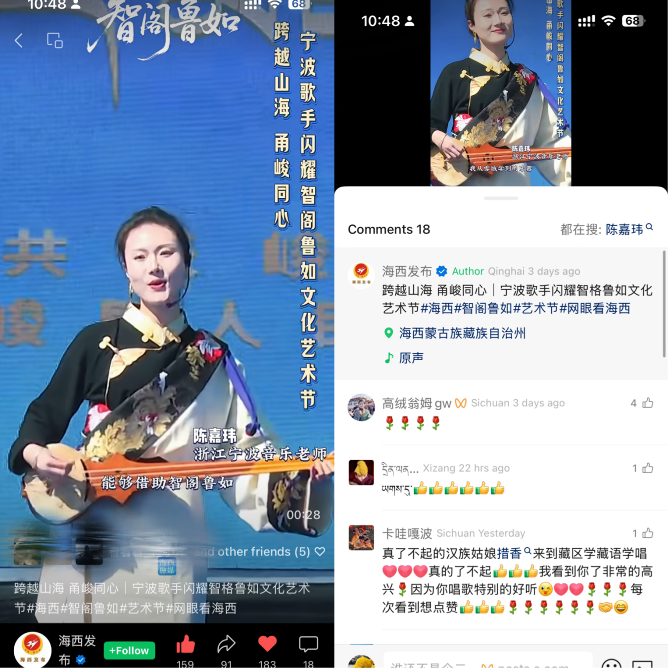 演出結束后,她的這段視頻在天峻的“朋友圈”火了!青海日報、海西發(fā)布紛紛對這位寧波姑娘進行報道。短短2天,《一曲藏歌甬峻情,寧波姑娘亮相天峻縣“智閣魯如”文化旅游藝術節(jié)》的視頻,在寧波之聲視頻號發(fā)布后,流量達到了8.7萬,點贊突破2千。同時,青海省級媒體與央廣網(wǎng)等主流媒體報道、轉(zhuǎn)載,全網(wǎng)流量突破了100萬。