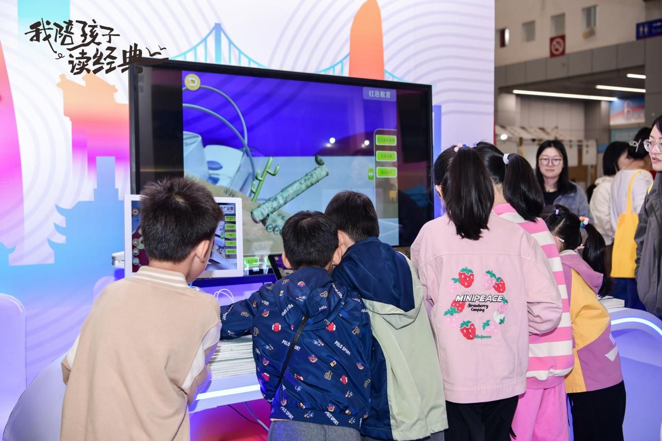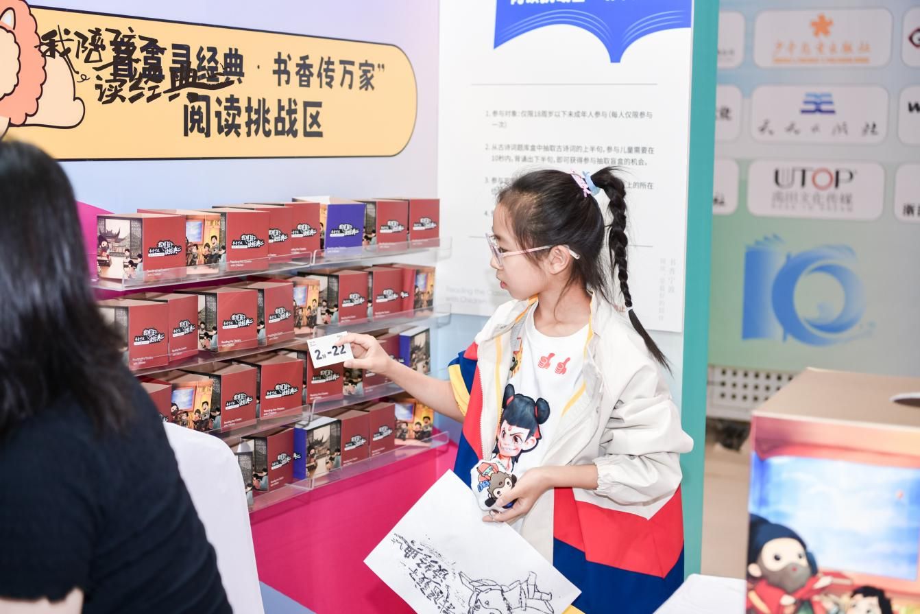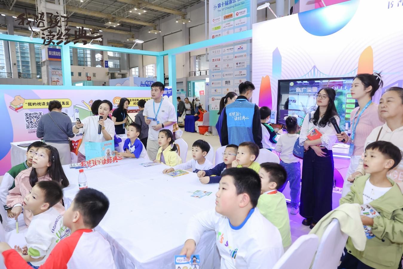 位于第十屆浙江書展6號(hào)館的“我陪孩子讀經(jīng)典”少兒館以“經(jīng)典閱讀+互動(dòng)體驗(yàn)”為核心,打造集優(yōu)質(zhì)讀物、文化傳承與趣味互動(dòng)于一體的親子閱讀空間,讓經(jīng)典浸潤童心、閱讀成為家庭共同成長的美好紐帶。邀請了30多家優(yōu)秀出版商專臺(tái)布置,精選中外經(jīng)典童話、傳統(tǒng)國學(xué)啟蒙、當(dāng)代優(yōu)質(zhì)繪本、科普百科、兒童文學(xué)等各類別適齡好書,營造豐富多元的閱讀環(huán)境,也設(shè)立“我陪孩子讀經(jīng)典”全民閱讀展示區(qū),展示200種經(jīng)典書單并通過圖文、視頻、陳列、互動(dòng)等形式,生動(dòng)呈現(xiàn)親子閱讀實(shí)踐案例、共讀心得與成長故事,激發(fā)更多家庭參與熱情與共鳴。其中“我陪孩子讀經(jīng)典”少兒館互動(dòng)區(qū)由文創(chuàng)互動(dòng)區(qū)、“我的悅讀主張”征集區(qū)、“盲盒尋經(jīng)典?書香傳萬家”閱讀挑戰(zhàn)區(qū)、數(shù)字閱讀互動(dòng)區(qū)、親子拓印體驗(yàn)區(qū)五大核心互動(dòng)區(qū)組成,共同為親子家庭打造了豐富的閱讀體驗(yàn)。