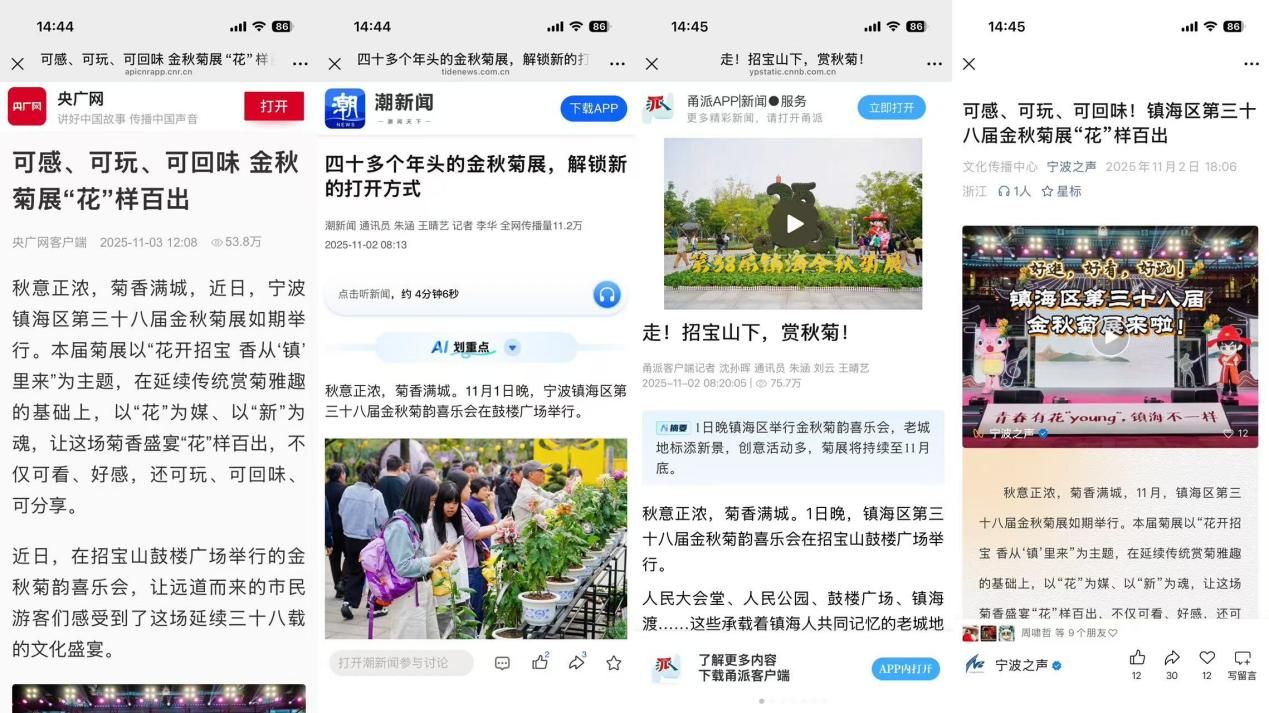 活動(dòng)受到了各級(jí)媒體的廣泛關(guān)注,依托央廣網(wǎng)、潮新聞、寧波文旅等中央、省、市級(jí)重點(diǎn)媒體平臺(tái),形成梯次化、持續(xù)性的宣傳矩陣。隨著菊展為期一個(gè)月的深入舉辦,相關(guān)報(bào)道與內(nèi)容持續(xù)推發(fā),推動(dòng)活動(dòng)熱度穩(wěn)步攀升。截至菊展中期,累計(jì)全網(wǎng)曝光量突破500萬,顯示出活動(dòng)廣泛的社會(huì)關(guān)注度和持續(xù)增強(qiáng)的品牌影響力。