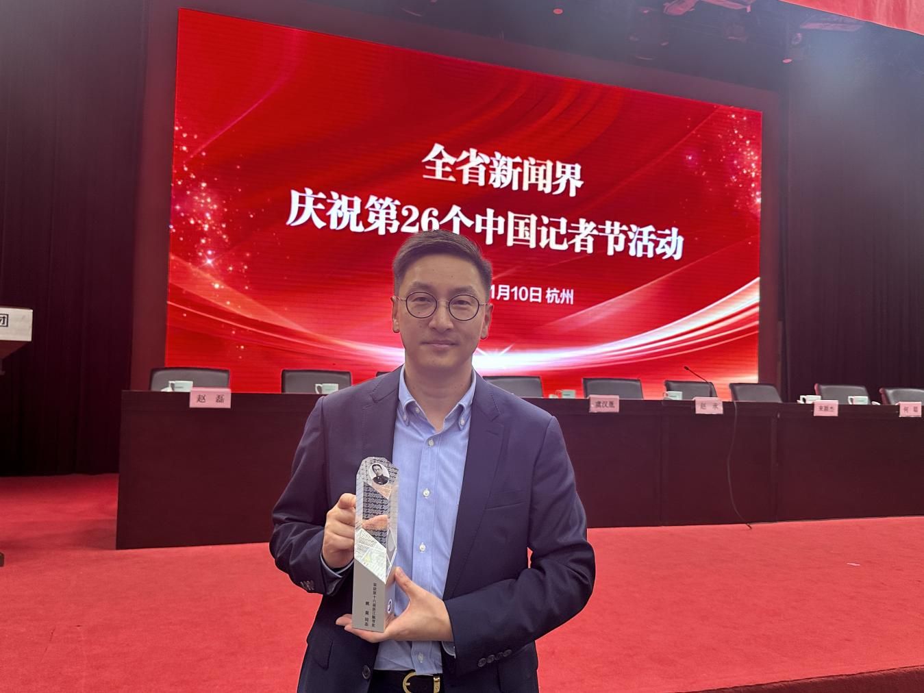 11月10日下午,浙江省新聞界慶祝第26個中國記者節(jié)暨頒獎報告會在杭州隆重舉行,會議向首屆“全國十佳新聞工作者”和中國新聞獎、浙江飄萍獎、浙江新聞獎獲獎代表頒獎。寧波廣電集團(tuán)姚昊作為第十六屆浙江飄萍獎獲得者,在報告會上接受表彰并發(fā)言。
