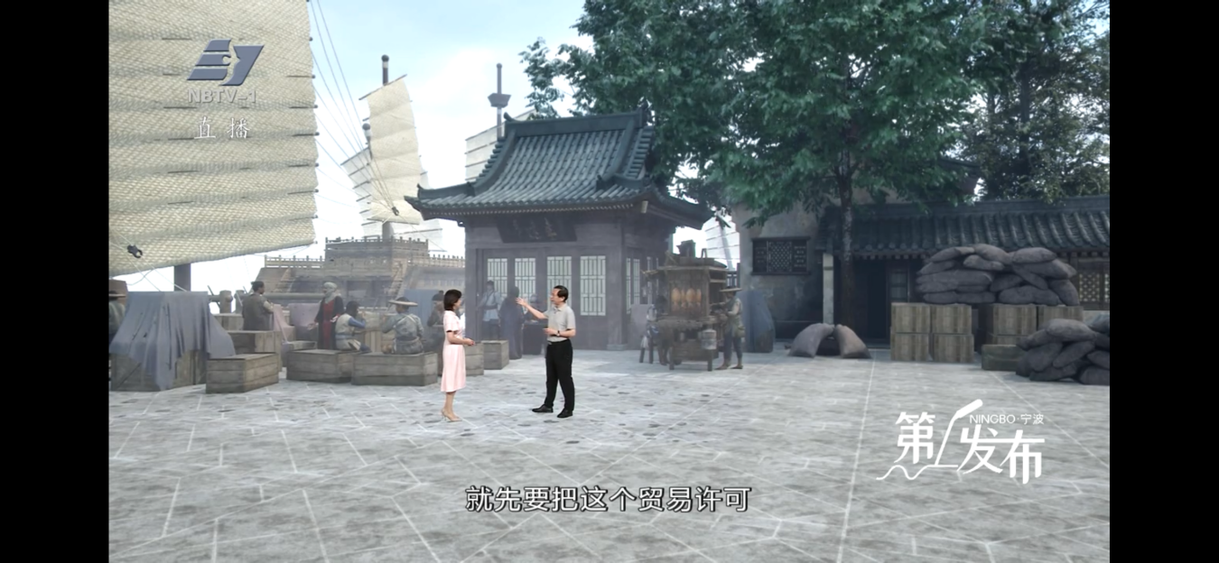 XR打造的虛擬場景加持是這一系列的一大亮點,實現(xiàn)多媒介融合,“時空雙線敘事”?。?每期節(jié)目前半部分在海洋文化地標取景,結合季節(jié)變化,增強視覺美感;“下半場”?XR場景的加入,?在實景基礎上疊加虛擬元素,如建筑遺跡,形成了“現(xiàn)實與歷史”的對話。其中第四期“潮起三江千帆競”中,XR技術復原了兩宋時期寧波港的重要組成部分——來安門。隨著發(fā)布人講述,這道“門”也動了起來,徐徐打開。當時的寧波港碼頭在屏幕里重生,主持人和發(fā)布人一同體驗海上貿易流程,從貨物裝卸到海關驗貨,沉浸式感受古代港口的商業(yè)活力。這期節(jié)目獲發(fā)布人肯定,XR場景使歷史敘事更具說服力。